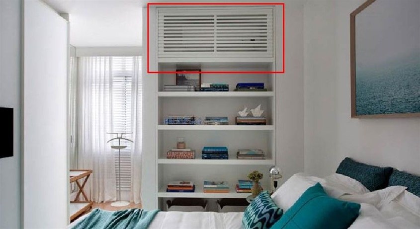 Điều hòa được lắp đặt bên trong một chiếc tủ sách, tủ treo,... (như hình minh họa) là cách lắp đặt giúp cho căn phòng của bạn trong gọn gàng và hài hòa hơn. Ở vị trí này, từ trên cao không khí lạnh sẽ lan tỏa xuống khắp phòng, làm mát cho người sử dụng.