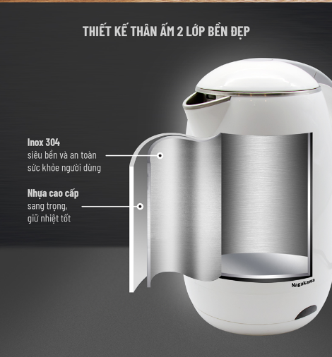 Thiết kế thân bình 2 lớp, gồm lớp ngoài là nhựa cao cấp chịu nhiệt tốt, độ sáng bóng đẹp và sang trọng, bên trong là inox 304 không gỉ, không gây độc hại cho người tiêu dùng, không làm sản sinh chất độc hại vào nước khi đun ở nhiệt độ cao, bền lâu khi sử dụng, nhờ đó đảm bảo sức khỏe cho người dùng.
