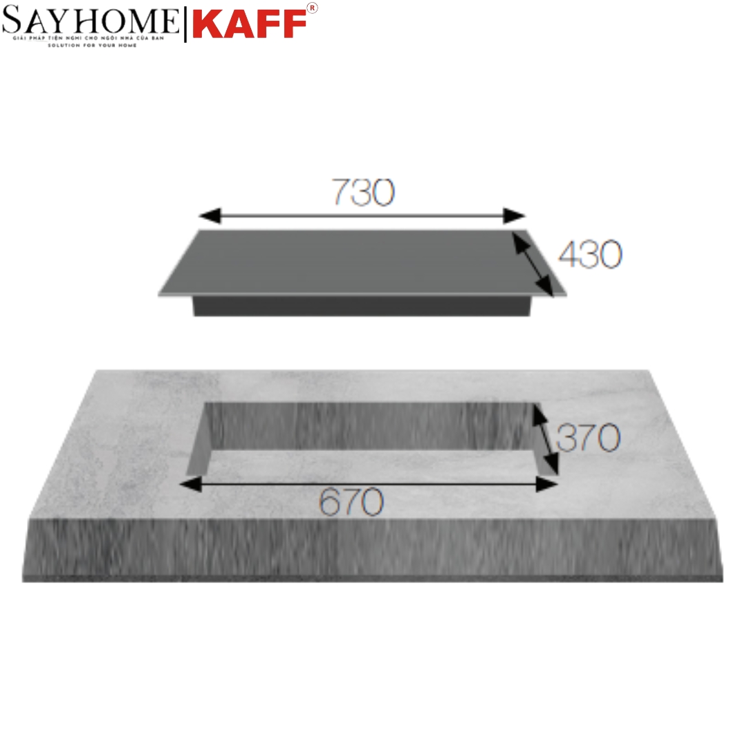 • Kích thước khoét đá: 670x370 mm