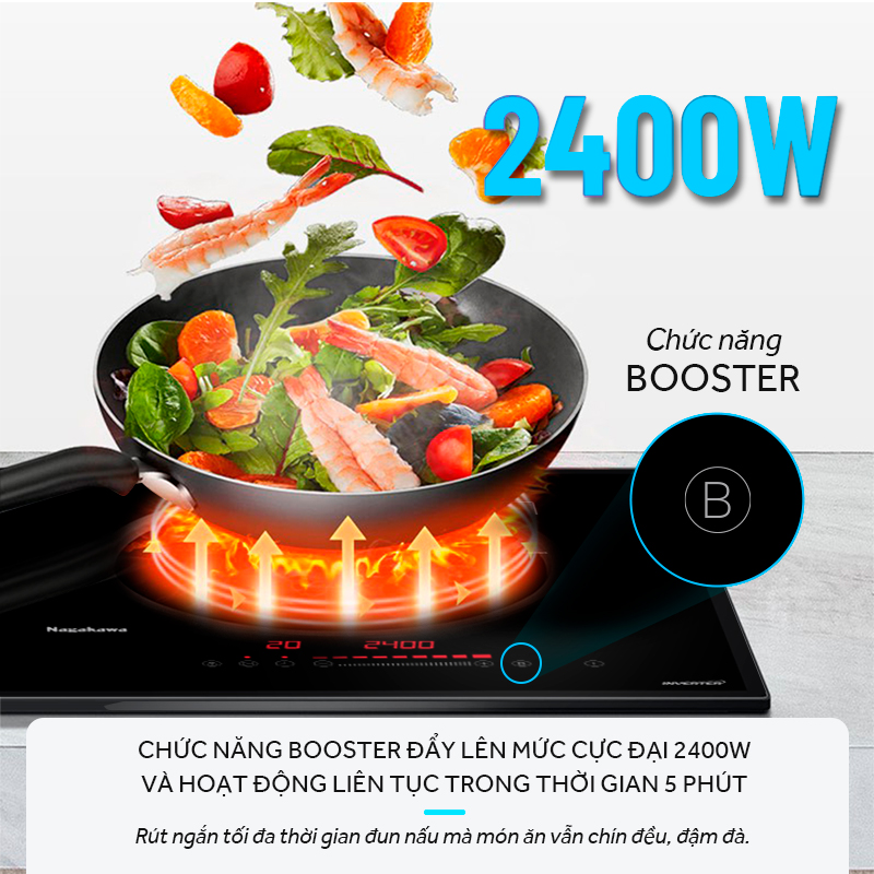 Khi lựa chọn chức năng Booster, công suất bếp đôi điện từ Nagakawa NAG1202M sẽ nhanh chóng được đẩy lên mức cực đại trong thời gian cực ngắn và hoạt động liên tục trong thời gian 5 phút, giúp rút ngắn tối đa thời gian đun nấu. Cụ thể, công suất bếp mặc định ở mức 1 là 400W, nếu chọn chức năng Booster, bếp nhanh chóng đạt công suất cực đại từ 2400W.