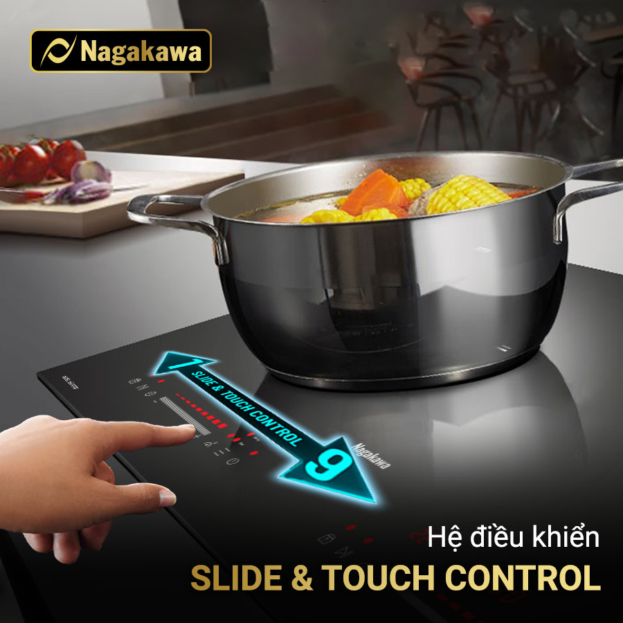 Với bếp đôi điện từ Nagakawa NAG1215M, bạn có thể lựa chọn cách điều chỉnh tăng giảm công suất bằng cách có thể vuốt di chuyển trái, phải hoặc trực tiếp ấn phím điều chỉnh 9 mức công suất.