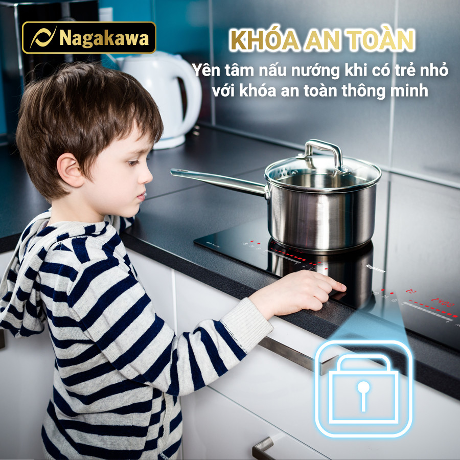Bếp đôi điện từ Nagakawa NAG1215M được trang bị khóa an toàn, giúp bạn yên tâm nấu nướng khi nhà có trẻ nhỏ. Bạn cũng có thể lựa chọn sử dụng phím, tránh tình trạng kích hoạt các nút không cần thiết khi cần vệ sinh mặt bếp.