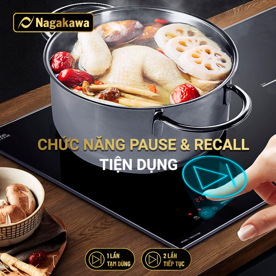 Khi bận việc đang lúc dở tay đun nấu, lúc này bạn có thể sử dụng phím Pause để tạm dừng hoạt động bếp. Khi trở lại, bạn chỉ cần ấn phím Pause một lần nữa, bếp đôi điện từ Nagakawa NAG1215M sẽ tiếp tục hoạt động bình thường với chương trình đã cài đặt trước đó.