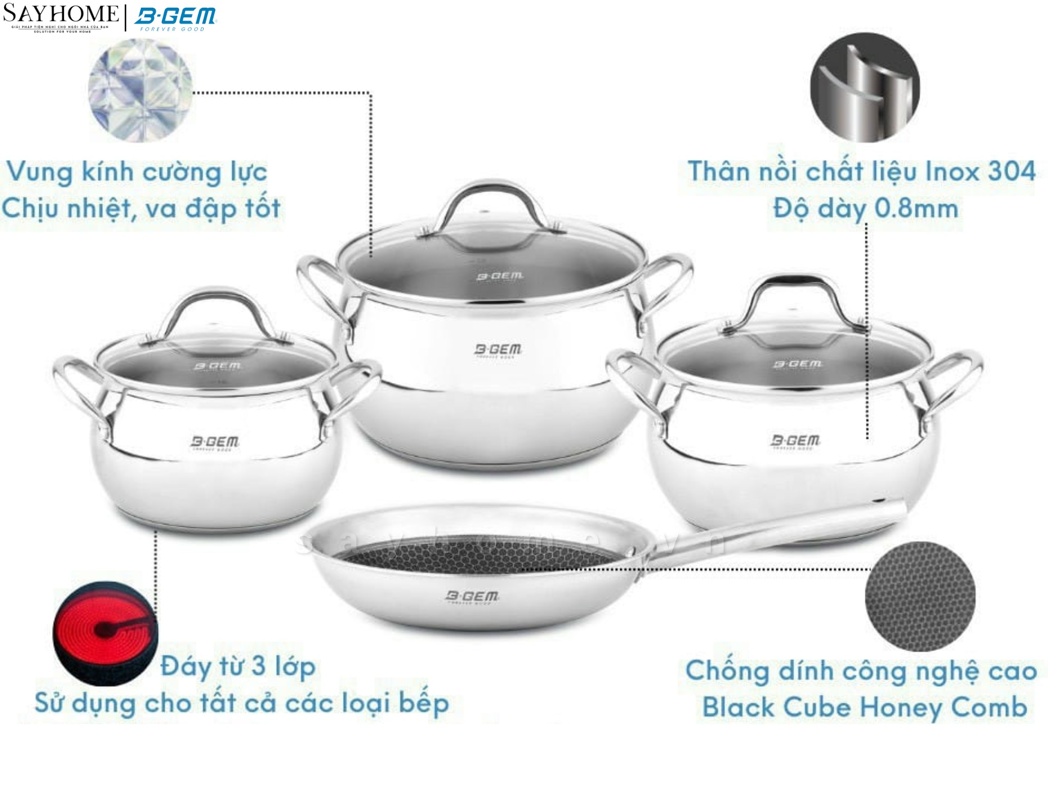 Bộ nồi inox cao cấp B-Gem Belly BG-988 ARIC inox 304 gồm 7 món: 3 nồi, 1 chảo và 3 nắp.