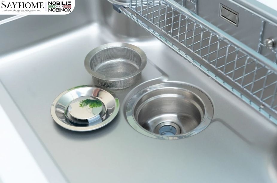 - Đi cùng là hệ thống 3 lớp lọc rác thông minh, giữ lại trọn vẹn cặn bã và thức ăn thừa, bảo vệ đường ống thoát nước luôn thông suốt, tránh tắc nghẽn.