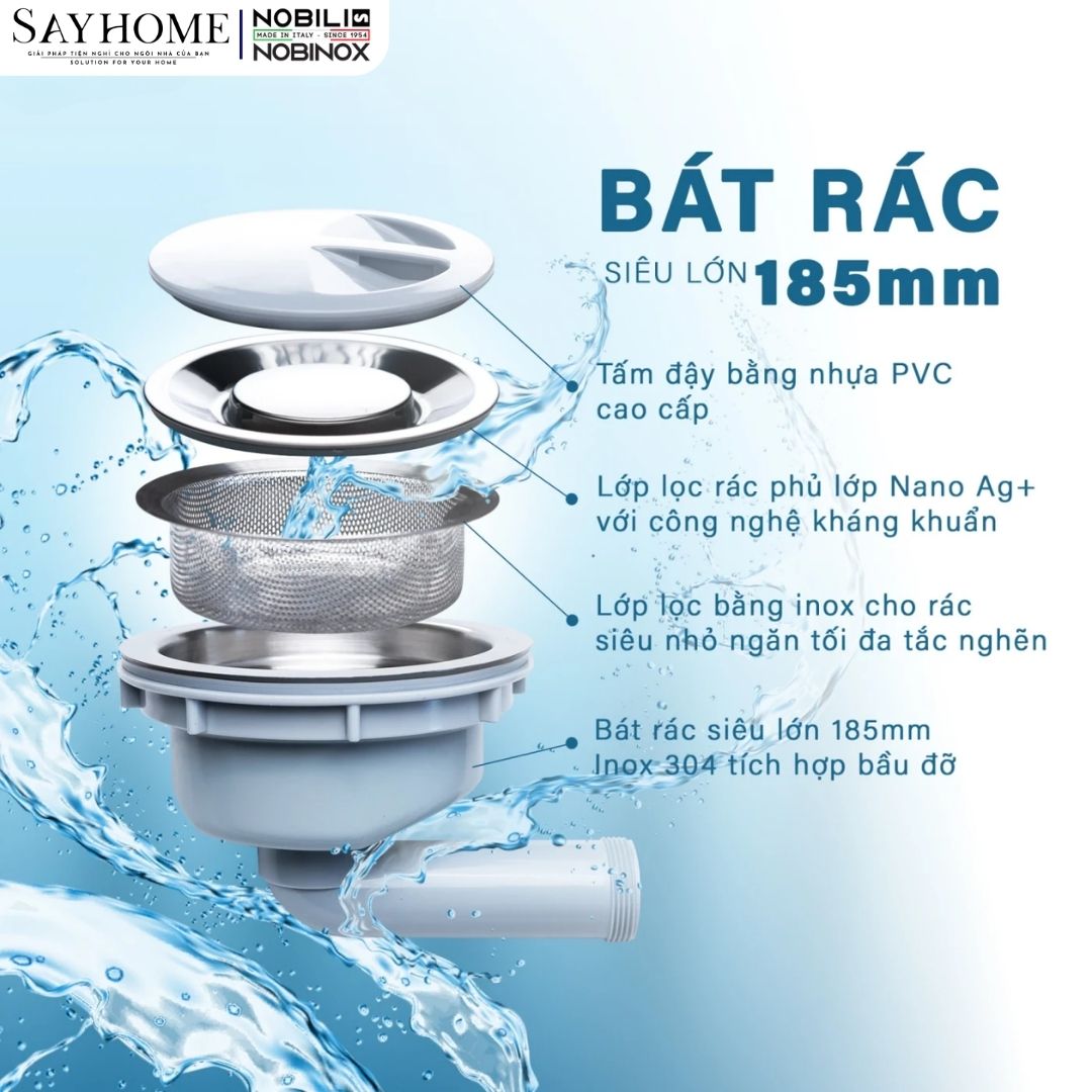 - Chậu rửa bát Nobinox ARVO B180 nâng tầm trải nghiệm nhờ bát rác có đường kính lên tới 185mm, mang lại hai lợi ích vượt trội: không gian chứa rác rộng rãi và khả năng thoát nước cực nhanh.