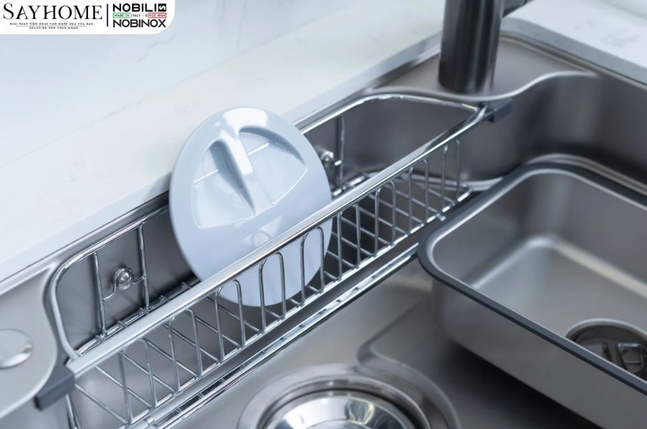 - Đi cùng là hệ thống 3 lớp lọc rác thông minh, giữ lại trọn vẹn cặn bã và thức ăn thừa, bảo vệ đường ống thoát nước luôn thông suốt, tránh tắc nghẽn.