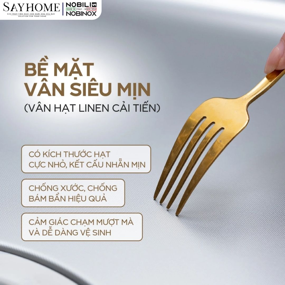 - Chậu rửa bát Nobinox được ứng dụng công nghệ xử lý bề mặt vân siêu mịn tiên tiến, tạo nên bước đột phá trong việc bảo vệ và duy trì vẻ đẹp sang trọng.