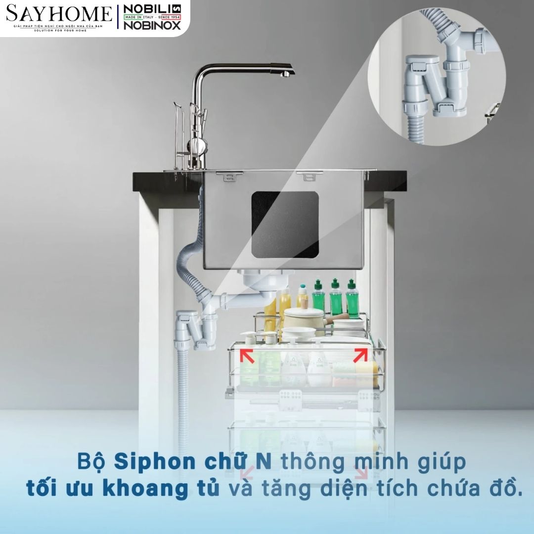 - Chậu rửa bát Nobinox được trang bị hệ thống xi phông hình chữ N - một thiết kế ưu việt không chỉ nâng cao hiệu quả sử dụng mà còn tối ưu hóa không gian khoang tủ bếp.