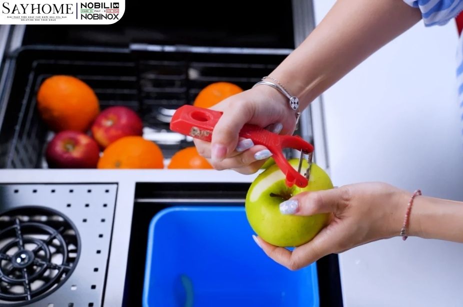 Hộc đựng rác được tích hợp thông minh. Được thiết kế như một ngăn riêng biệt, nhỏ gọn và liền khối với chậu, hộc đựng rác này cho phép bạn thu gom ngay các loại rác thải nhỏ như vỏ rau củ, cặn bã thực phẩm trong quá trình sơ chế trực tiếp tại bồn rửa. Thao tác này cực kỳ tiện dụng vì giúp giữ cho khu vực làm việc chính luôn sạch sẽ, thông thoáng, loại bỏ thao tác di chuyển qua lại đến thùng rác lớn, từ đó tối ưu hóa quy trình nấu nướng và dọn dẹp, mang lại trải nghiệm nội trợ gọn gàng và hiệu quả hơn.