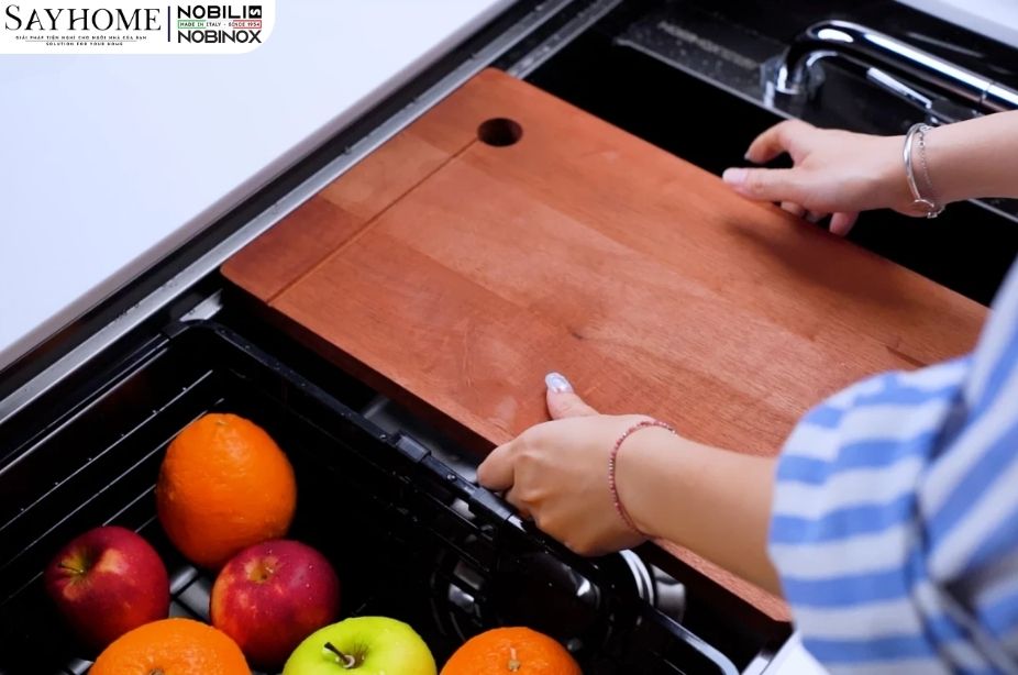 Chậu rửa Nobinox Lumia NJ511B không chỉ là một thiết bị đơn lẻ, mà là một trung tâm tiện ích hoàn chỉnh nhờ được tích hợp sẵn bộ phụ kiện bếp đa dạng và tinh tế. Bộ sản phẩm đi kèm bao gồm các vật dụng thiết yếu như thớt gỗ để sơ chế, xịt cốc (máy rửa cốc) chuyên dụng, hộc đựng rác mini tiện lợi, rổ lọc và khay đựng, cùng bình đựng nước rửa bát. Đặc biệt, 2 tấm đậy inox cho phép bạn biến mặt chậu thành một mặt phẳng làm việc mở rộng khi không dùng đến. Sự kết hợp đa dạng này giúp cho mọi thao tác vào bếp trở nên nhẹ nhàng và đơn giản hơn rất nhiều, từ khâu chuẩn bị, chế biến đến dọn dẹp, mọi công cụ đều trong tầm tay, tối ưu hóa quy trình và tiết kiệm thời gian cho người nội trợ.