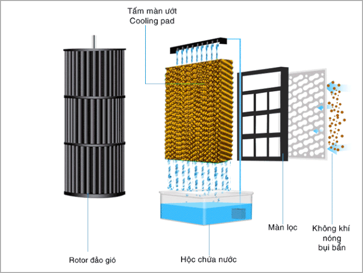 Quạt điều hòa hoạt động dựa trên nguyên lý vận hành hơi nước bằng cách bốc hơi nước tự nhiên (để dễ hiểu bạn có thể liên tưởng đến việc ao hồ, thác bốc hơi lên cao). Khi khởi động quạt, không khí bên ngoài sẽ đi vào tấm lọc bụi rồi qua tấm làm mát, sau đó trả không khí ra bên ngoài.