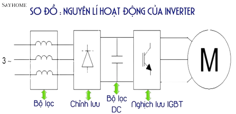 - Nguyên lý hoạt động của công nghệ Inverter tương đối đơn giản. Đầu tiên, biến tần sử dụng nguồn điện 1 pha hoặc 3 pha đã được chỉnh lưu và lọc thành nguồn 1 chiều bằng phẳng.