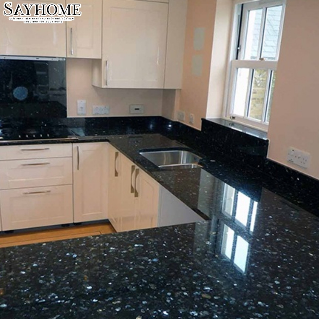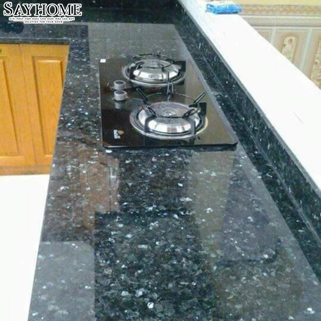 Ốp mặt bếp – bàn đảo: Bề mặt đá bóng mịn, không thấm nước và dễ lau chùi khiến Xà Cừ Xanh Đen trở thành lựa chọn lý tưởng cho mặt bếp và bàn đảo bếp. Đặc biệt, những ánh xà cừ lấp lánh dưới ánh đèn tạo điểm nhấn ấn tượng cho không gian bếp, vừa tiện nghi vừa đậm chất thẩm mỹ. Đá không bị ố màu khi tiếp xúc thực phẩm, dầu mỡ và có thể giữ nguyên vẻ đẹp suốt nhiều năm sử dụng.
