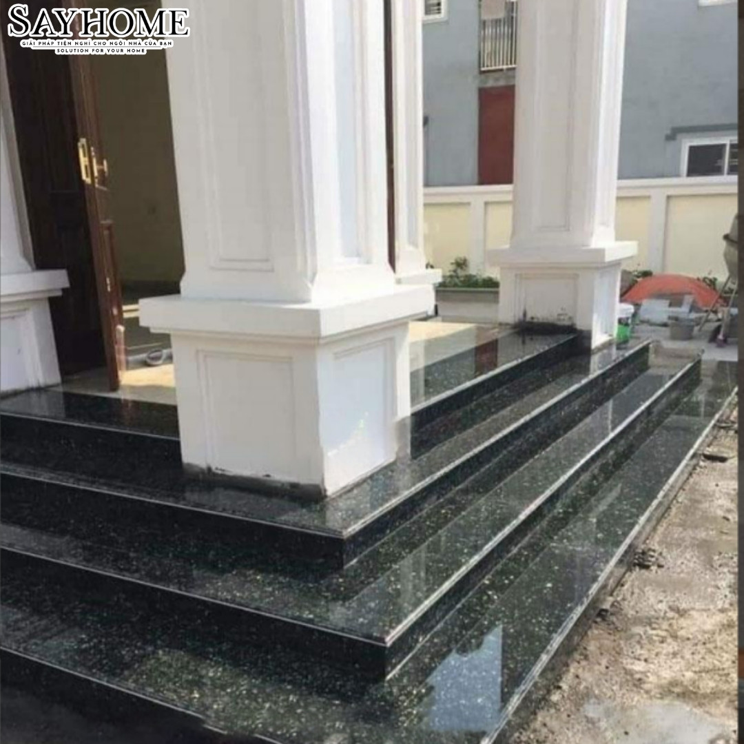 Cầu thang – bậc tam cấp: Nhờ độ cứng cao, chống trầy xước tốt và khả năng chịu tải lớn, Xà Cừ Xanh Đen là vật liệu lý tưởng cho cầu thang trong nhà lẫn ngoài trời. Đặc biệt, khi kết hợp với đèn chiếu hoặc lan can kính, đá tạo nên hiệu ứng ánh sáng lung linh, nâng tầm toàn bộ kiến trúc nội thất.