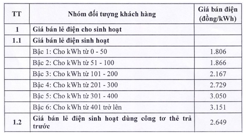Giá bán lẻ điện cho sinh hoạt của EVN (cập nhật đến tháng 05/2024) được quy định như sau: