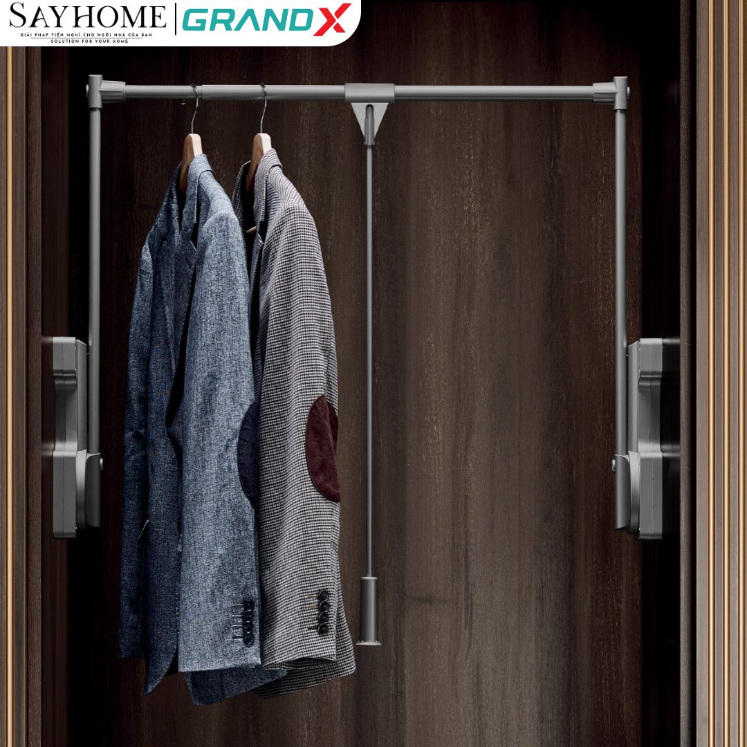 - Với sự trợ giúp của giá nâng hạ cơ treo quần áo GrandX XM.15-Luxury, bạn có thể treo quần áo lên móc treo với không gian hệ tủ cao, giúp quần áo không bị nhăn, mang lại vẻ đẹp thẩm mỹ và dễ sử dụng.