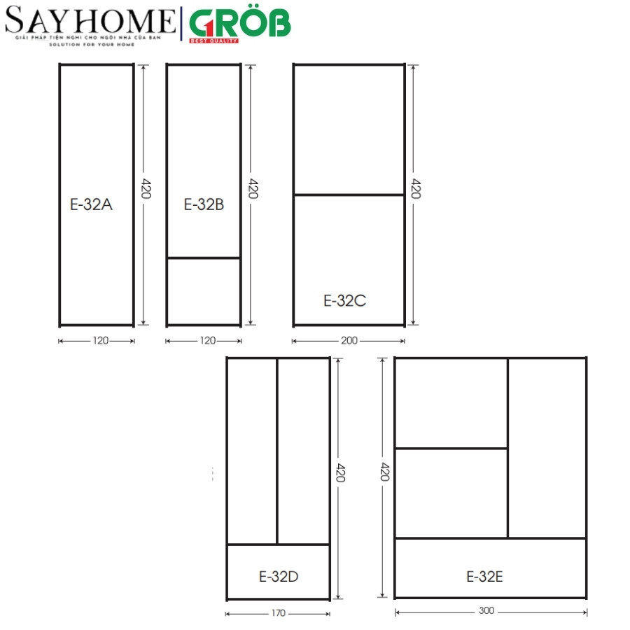 - E- 32A: 120*420*64mm - E- 32B: 120*420*64mm - E- 32C: 200*420*64mm - E- 32D: 170*420*64mm - E-32E: 300*420*64mm - E - 32A + E - 32E: 420*420*64mm - E - 32C + E - 32E: 520*420*64mm |