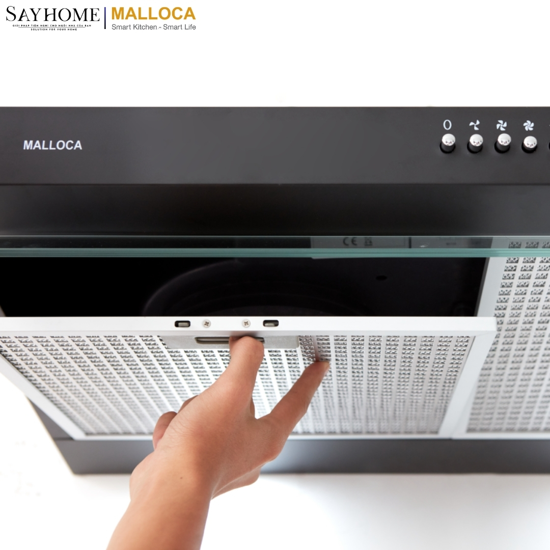 - Thương hiệu bếp Malloca trang bị cho máy đến 4 vỉ lọc dầu mỡ bằng chất liệu nhôm. Ưu điểm là giữ lại bụi bẩn, khói và dầu mỡ tối đa trước khi chúng được xử lý qua tha hoạt tính bên trong.