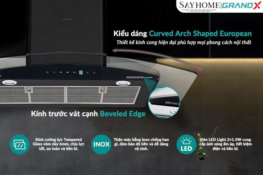 MÁY HÚT MÙI KÍNH CONG, MÀU ĐEN GRANDX GX H70C62B/ GX H90C62B - HÀNG CHÍNH HÃNG