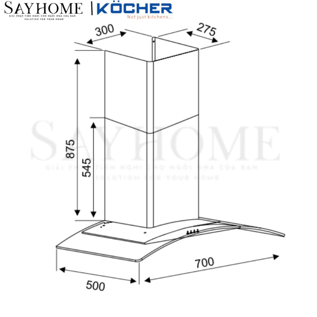 Kích thước lắp đặt sản phẩm máy hút mùi kocher K-8870/8890 (70cm/90cm)
