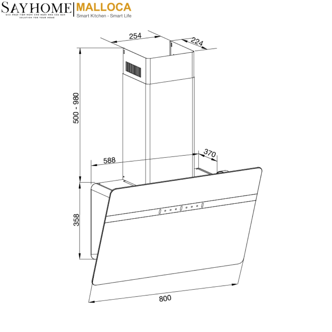- Với thiết kế kính vát cùng kích thước 80cm, Máy hút mùi Malloca MC 80ECO là lựa chọn phù hợp cho những căn bếp có không gian rộng rãi, không bị hạn chế về chiều ngang.