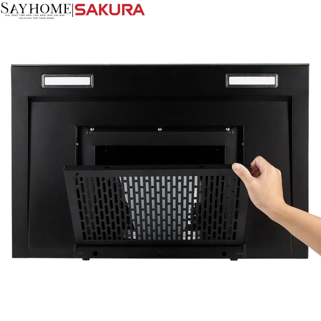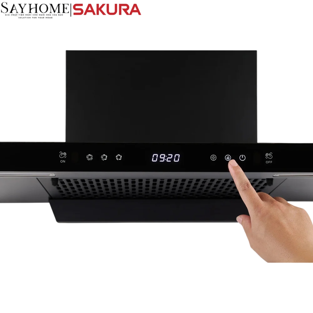 - Đặc biệt đáng chú ý trên máy hút mùi Sakura SR-7800B này là tích hợp công nghệ cảm biến vẫy tay thông minh. Cho phép bạn thực hiện chuyển động vẫy tay trước màn hình cảm ứng của máy, là có thể bật/tắt máy, tăng/giảm tốc độ hút mà không cần thao tác trực tiếp trên máy, rất tiện dụng trong trường hợp tay bạn đang ướt hay dính bẩn.