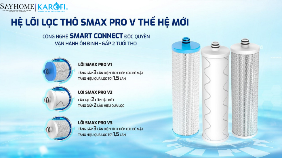 Nâng cấp hệ lõi lọc Smax Pro V độc quyền, tăng gấp 3 lần diện tích tiếp xúc với nước, tăng đến gấp 2 lần hiệu quả lọc. Ứng dụng công nghệ Smart Connect giúp vận hành ổn định, đồng thời nâng cao tuổi thọ lõi lọc gấp 2 lần so với thế hệ lõi lọc thô thế hệ cũ.