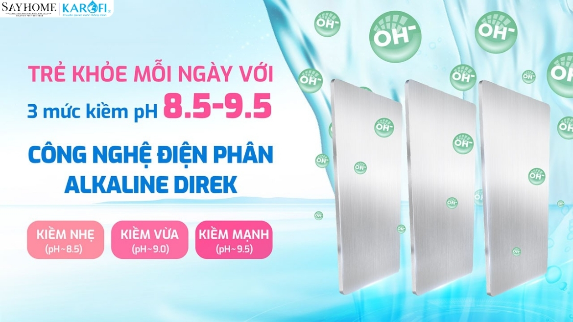 1.6. Công nghệ Alkaline Direk: Sử dụng 3 tấm điện cực Titanium mạ Bạch Kim kết hợp với màng ngăn hiện đại giúp tăng gấp đôi hiệu suất điện phân, tăng gấp 3 hàm lượng hydrogen (lên đến 1300ppb) có trong nước Hydro-ion kiềm, chỉ số ORP tối ưu (-600mV). Tùy chọn 3 mức kiềm: pH ~8.5 - 9 - 9.5