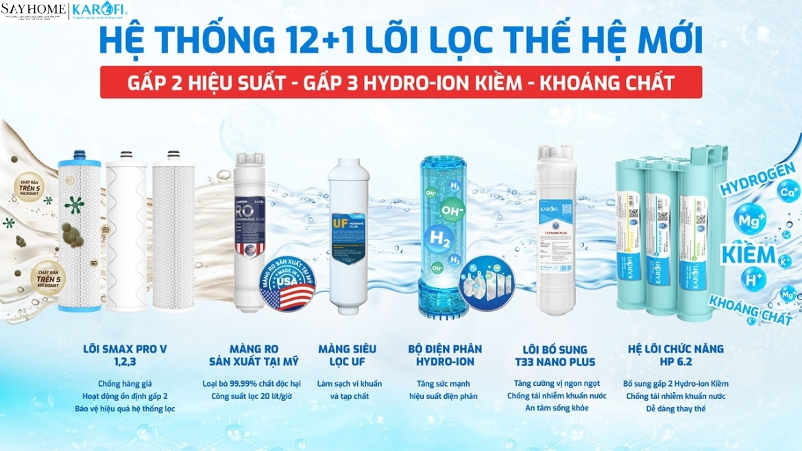 Đằng sau vẻ ngoài tinh xảo là hệ thống 12+1 lõi lọc hiện đại với khả năng tạo nguồn nước tốt toàn diện. Đồng thời, duy nhất tại Karofi sở hữu công nghệ lọc Smax của Karofi: Gấp 2 hiệu suất, gấp 2 tuổi thọ.