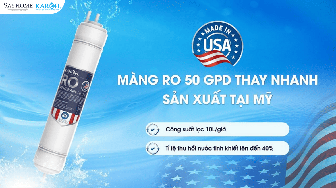 | Màng lọc | Màng RO 50 GPD thay nhanh sản xuất tại Mỹ |