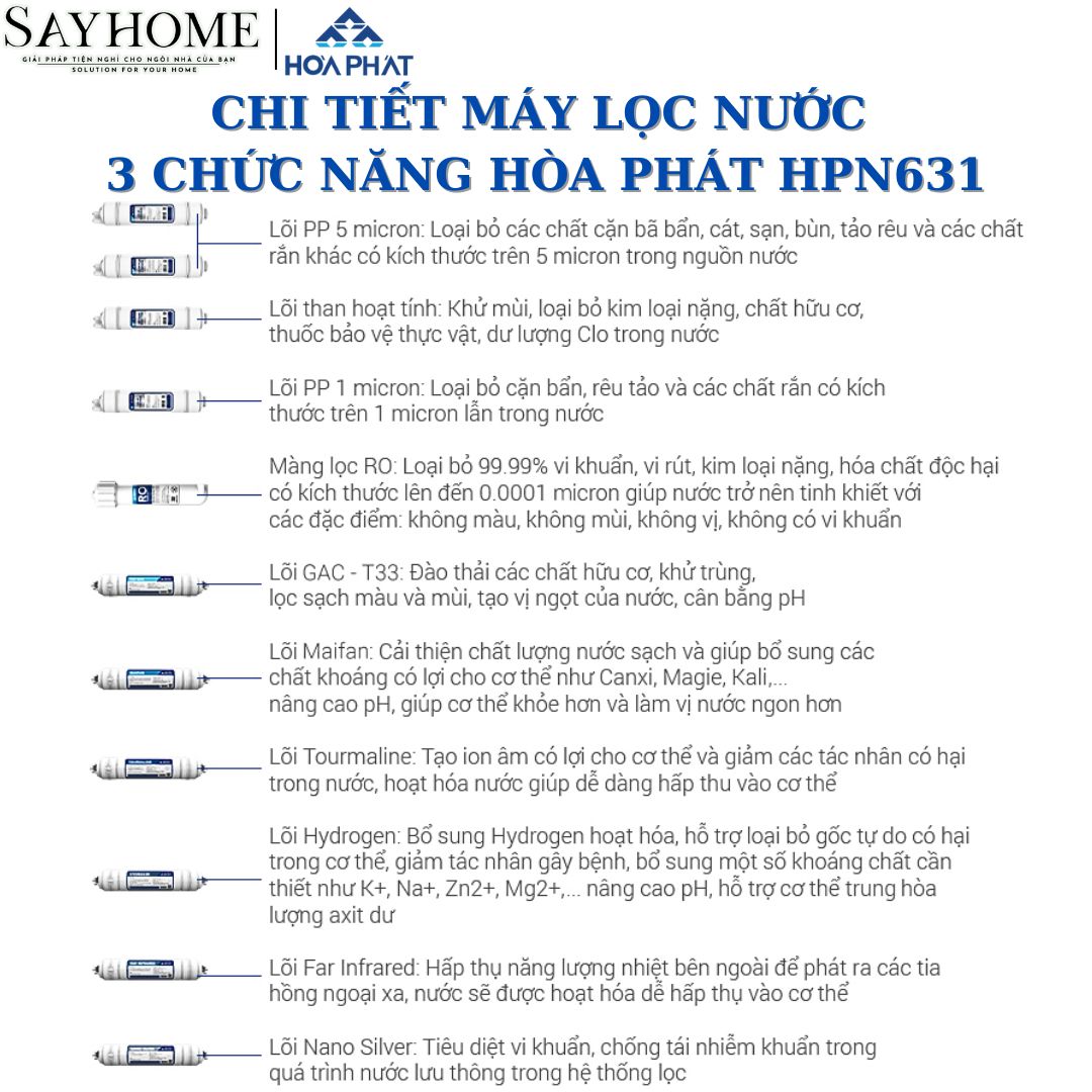 Máy lọc nước RO Hòa Phát HPN631 cung cấp 3 chế độ lấy nước nóng – nguội – lạnh công suất 20L/ giờ, với 11 lõi lọc với màng lọc RO 100 GPD từ Hàn Quốc, công nghệ làm lạnh Chip điện tử vận hàng êm ái,.