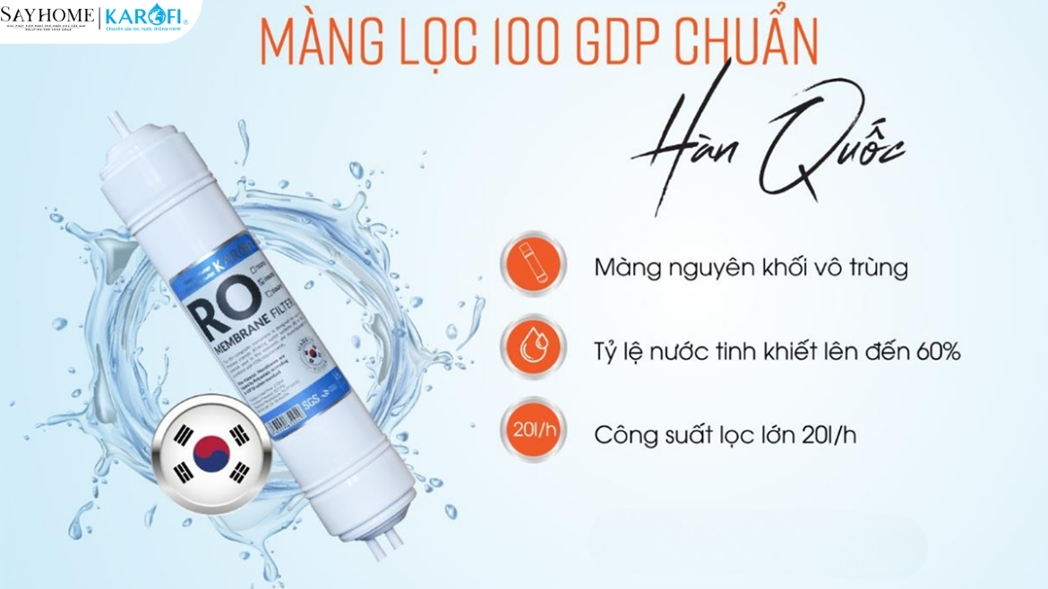 Màng RO 100GPD Hàn Quốc, công suất lọc lớn: Màng RO thay nhanh Hàn Quốc cho hiệu suất lọc cao, tuổi thọ bền bỉ, lọc nhanh 20 lít/giờ, đáp ứng nhu cầu sử dụng nước của gia đình.