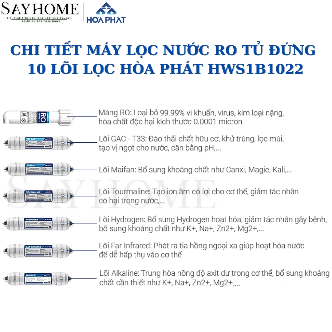 Hệ thống 06 lõi lọc chức năng của máy lọc nước RO nóng lạnh Hòa Phát HWS1B1022: