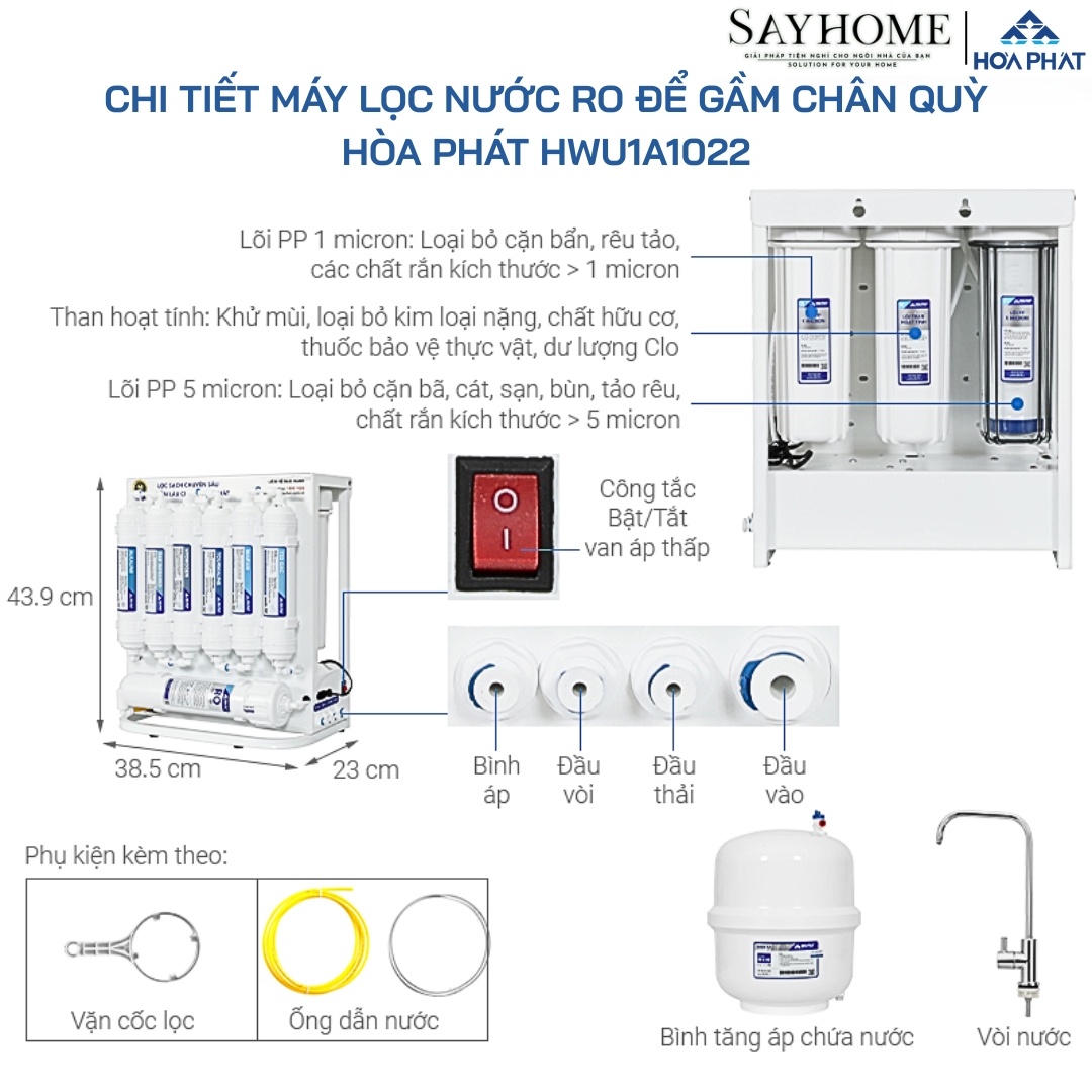 MÁY LỌC NƯỚC VỚI 10 LÕI LỌC RO HÒA PHÁT ĐỂ GẦM CHÂN QUỲ HWU1A1022 - BẢO HÀNH CHÍNH HÀNG 36 THÁNG