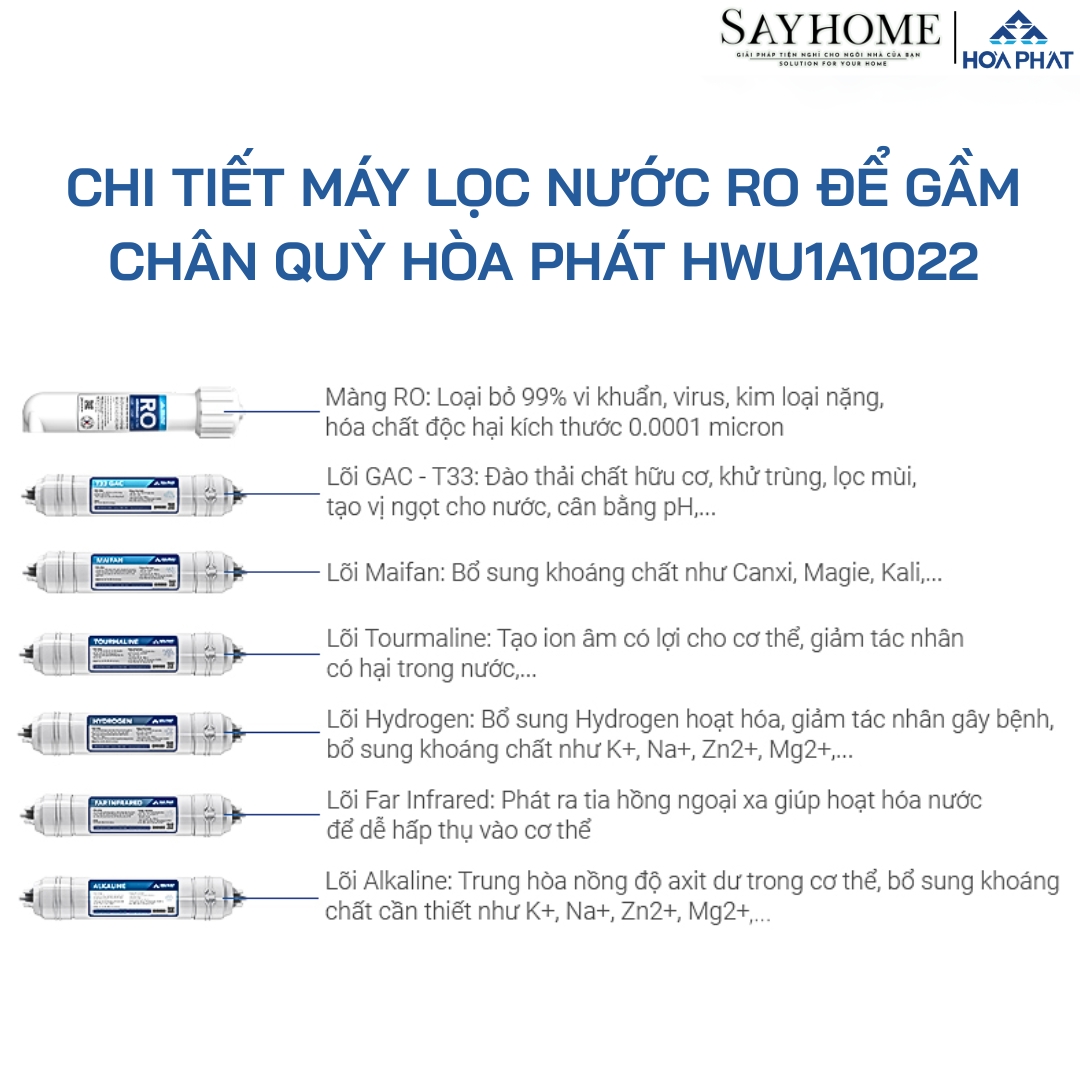 Hệ thống 06 lõi lọc chức năng của máy lọc nước Hòa Phát HWU1A1022: