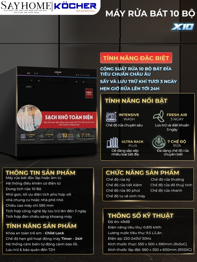 Máy rửa bát Köcher X10 có thông số kỹ thuật tối ưu, phù hợp với nhu cầu sử dụng của các gia đình trẻ: