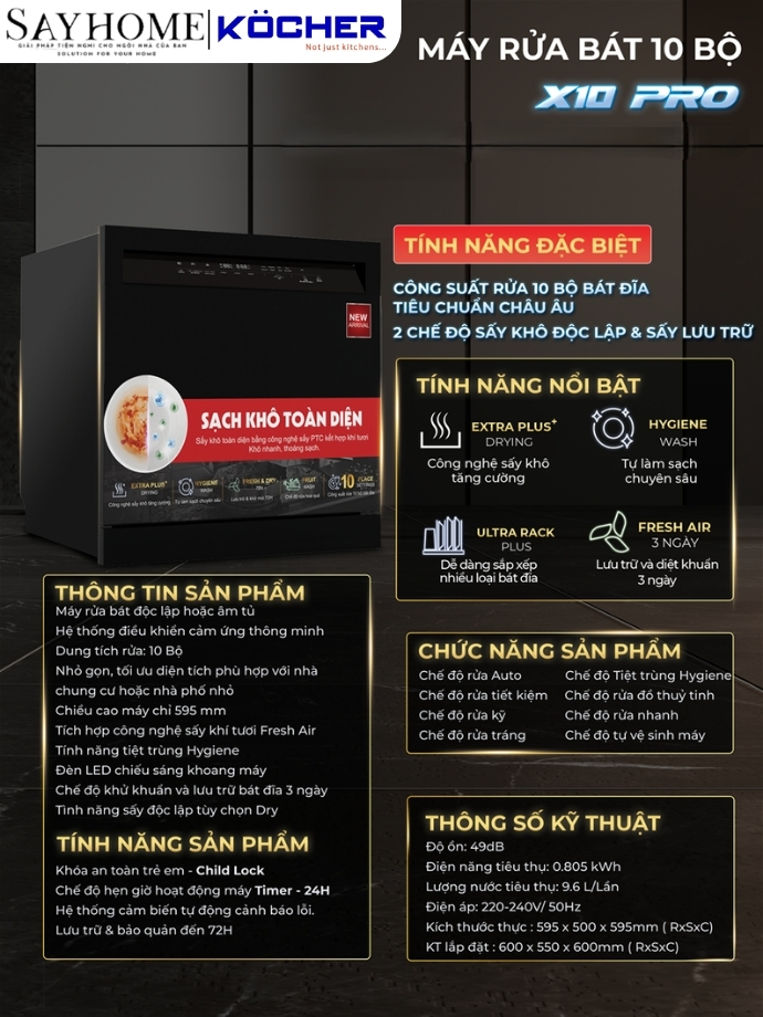 MÁY RỬA BÁT KOCHER X10 PRO 10 BỘ ĐỒ ĂN CHÂU ÂU - BẢO HÀNH CHÍNH HÃNG 3 NĂM
