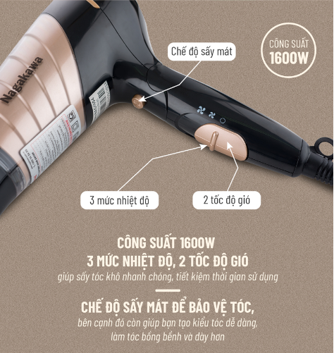 Máy sấy tóc NAG1604 có 3 mức nhiệt độ, 2 tốc độ giúp thổi ra lưu lượng gió nhiều hơn, sấy tóc khô nhanh chóng, sẽ tiết kiệm được thời gian cho các chị em. Có 1 chế độ sấy mát