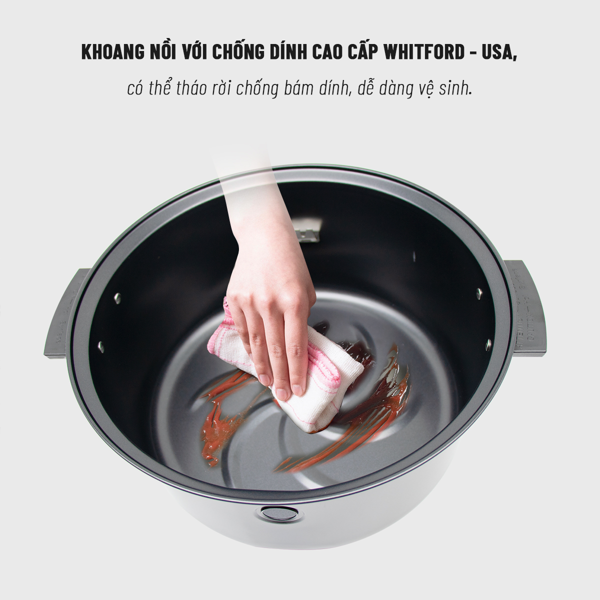Đặc biệt hơn với khoang lò với chống dính cao cấp Whitford - USA, có thể tháo rời, lớp chống dính này giúp thực phẩm không bị dính hoặc bám vào thành/lòng nồi, giúp việc lau rửa nhẹ nhàng hơn. Thiết kế nắp lò trong suốt giúp cho việc dễ dàng quan sát thực phẩm trong khi được chế biến.