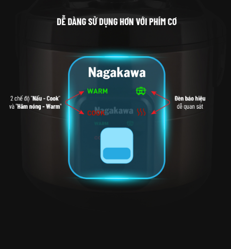 Nồi cơm điện Nagakawa NAG0133 có ưu điểm là nồi cơm điện cơ nên dễ dàng sử dụng với mọi đối tượng với 2 chế độ "Nấu - Cook" và "Hâm nóng - Warm" chỉ bằng điều chỉnh nút gạt đơn giản, có đèn báo hiệu dễ quan sát.