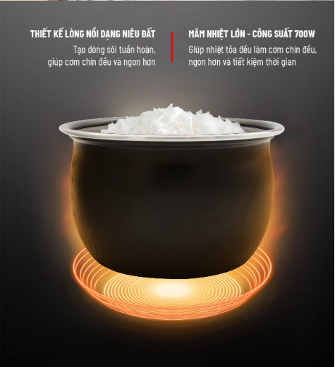 Thiết kế lòng nồi dạng niêu đất tạo dòng sôi tuần hoàn, giúp cơm chín đều và ngon hơn. Dung tích nồi tới 1,8L đáp ứng được mọi nhu cầu nấu, phù hợp với gia đình từ 3-5 người