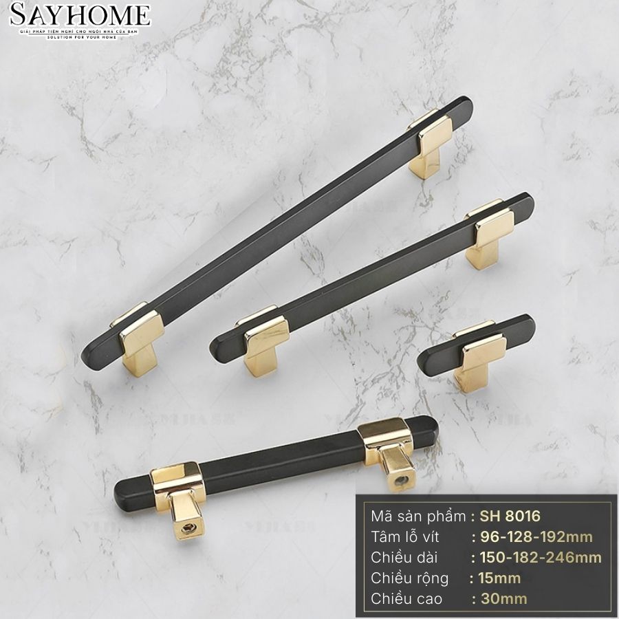 Tay Nắm Tủ Hiện Đại SH8016 nổi bật với sự kết hợp màu sắc đầy cuốn hút giữa đen hiện đại và vàng bóng sang trọng. Thiết kế mang hơi thở đương đại nhưng vẫn giữ được nét tinh tế cổ điển, tạo nên một điểm nhấn khác biệt cho không gian nội thất.