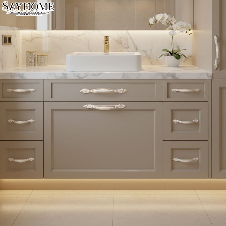 Trong thiết kế nội thất châu Âu, sự thanh lịch luôn đến từ những chi tiết nhỏ được chăm chút kỹ lưỡng. Tay nắm tủ phong cách Châu Âu SH9340 đến từ SAYHOME gây ấn tượng với sự kết hợp hài hòa giữa hai gam màu trắng ngọc trai – vàng, mang lại vẻ đẹp tươi mới, nhẹ nhàng nhưng vẫn toát lên sự sang trọng cho tổng thể không gian.