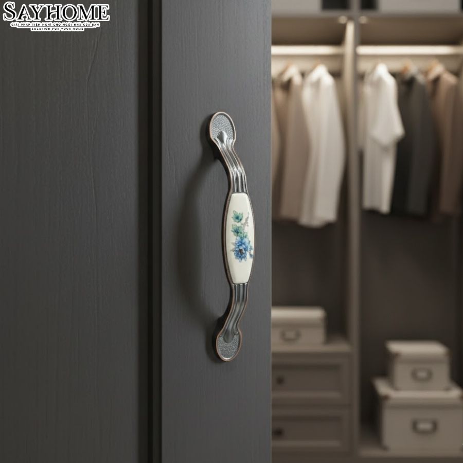 Trong không gian nội thất mang phong cách châu Âu cổ điển, những chi tiết gốm sứ tinh xảo luôn góp phần tạo nên vẻ đẹp sang trọng và đầy cảm xúc. Tay nắm cửa tủ gốm sứ SH9023 đến từ SAYHOME nổi bật với hoa văn được khắc họa tinh tế trên nền sứ trang nhã, mang lại điểm nhấn duyên dáng và nâng tầm giá trị thẩm mỹ cho từng hệ tủ.