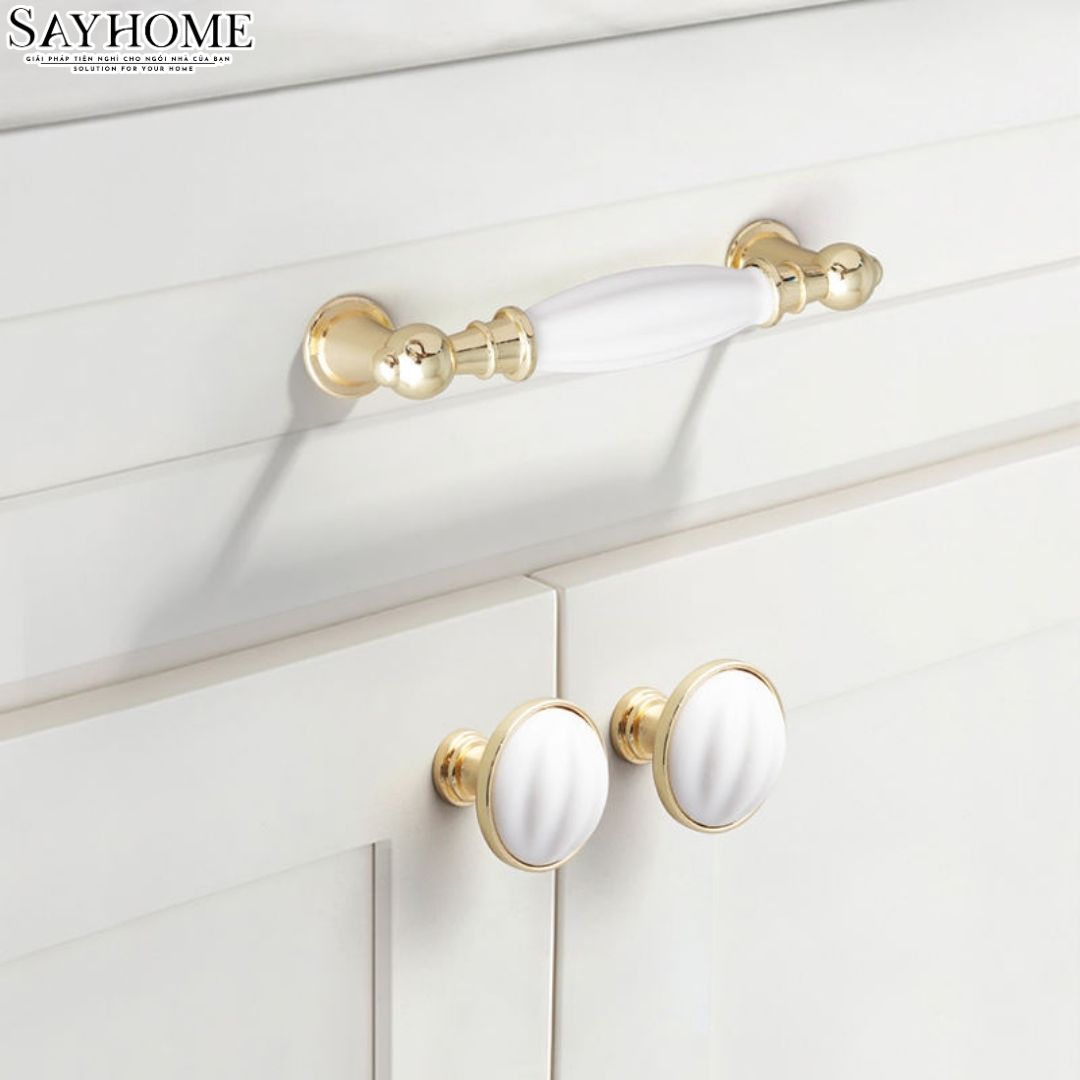 TAY NẮM TỦ TÂN CỔ ĐIỂN MÀU VÀNG MẶT SỨ TRẮNG SH5651