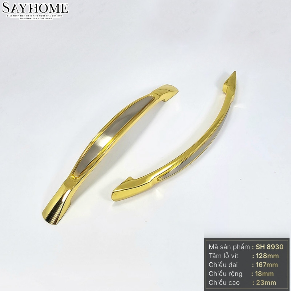 Tay nắm SH8930 mang đến diện mạo sang trọng và thời thượng cho không gian nội thất nhờ sự kết hợp tinh tế giữa màu vàng bóng rực rỡ và bạc xước hiện đại, tạo nên điểm nhấn hài hòa và đẳng cấp cho mọi thiết kế tủ.