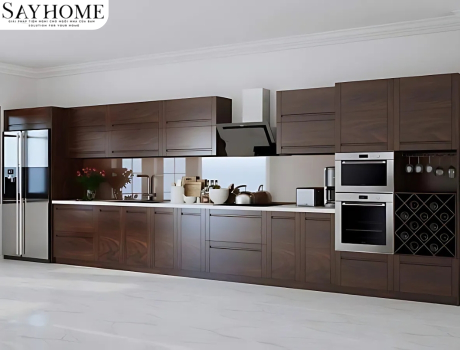 Thẩm mỹ hiện đại – tăng giá trị ngôi nhà: Tủ bếp hiện đại có kiểu dáng đa dạng: chữ I, chữ L, chữ U, tủ bếp có quầy bar, tủ bếp âm tường... Phối hợp vật liệu như gỗ công nghiệp phủ melamine, gỗ tự nhiên sơn PU, nhựa PVC chống nước, mặt bếp ốp đá granite hoặc đá nhân tạo, tạo nên vẻ ngoài sang trọng, đẳng cấp cho không gian bếp.