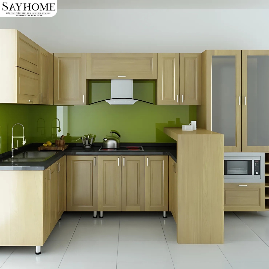 Thẩm mỹ hiện đại – tăng giá trị ngôi nhà: Tủ bếp hiện đại có kiểu dáng đa dạng: chữ I, chữ L, chữ U, tủ bếp có quầy bar, tủ bếp âm tường... Phối hợp vật liệu như gỗ công nghiệp phủ melamine, gỗ tự nhiên sơn PU, nhựa PVC chống nước, mặt bếp ốp đá granite hoặc đá nhân tạo, tạo nên vẻ ngoài sang trọng, đẳng cấp cho không gian bếp.