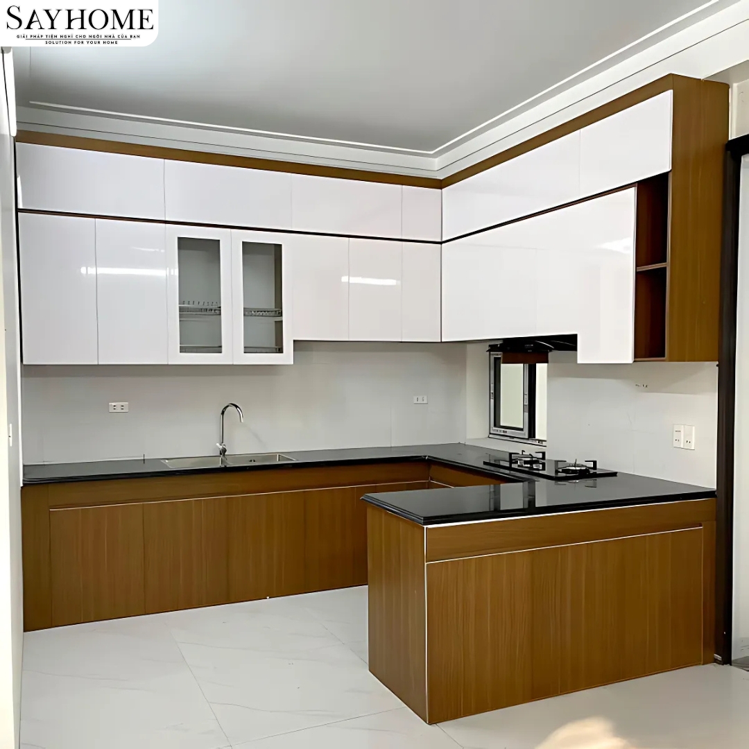 Không chỉ là nơi nấu nướng, căn bếp ngày nay còn là một phần quan trọng trong tổng thể nội thất – thể hiện cá tính và gu thẩm mỹ của gia chủ. Với thiết kế chữ U linh hoạt, bạn có thể dễ dàng phối màu tủ bếp theo nhiều phong cách khác nhau. Bạn có thể kết hợp 2 tông màu (tủ trên – tủ dưới), chọn mặt đá trắng vân mây hoặc đá đen kim sa tùy cá tính và gu thẩm mỹ riêng.